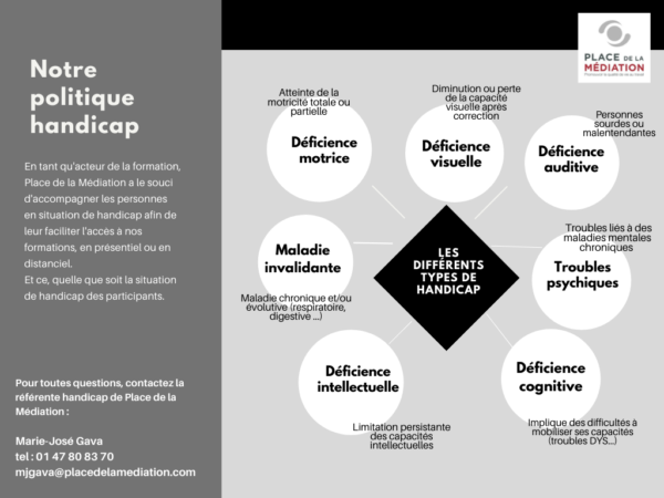 Place de la Médiation (SASU Immédiation) est certifiée QUALIOPI pour ses actions de formation (télécharger le Certificat F1450. Cette certification atteste de la qualité du processus mise en place par notre organisme en faveur du développement des compétences des participants, conformément aux décrets 2019-564 et 2019-565 du 6 juin 2019.